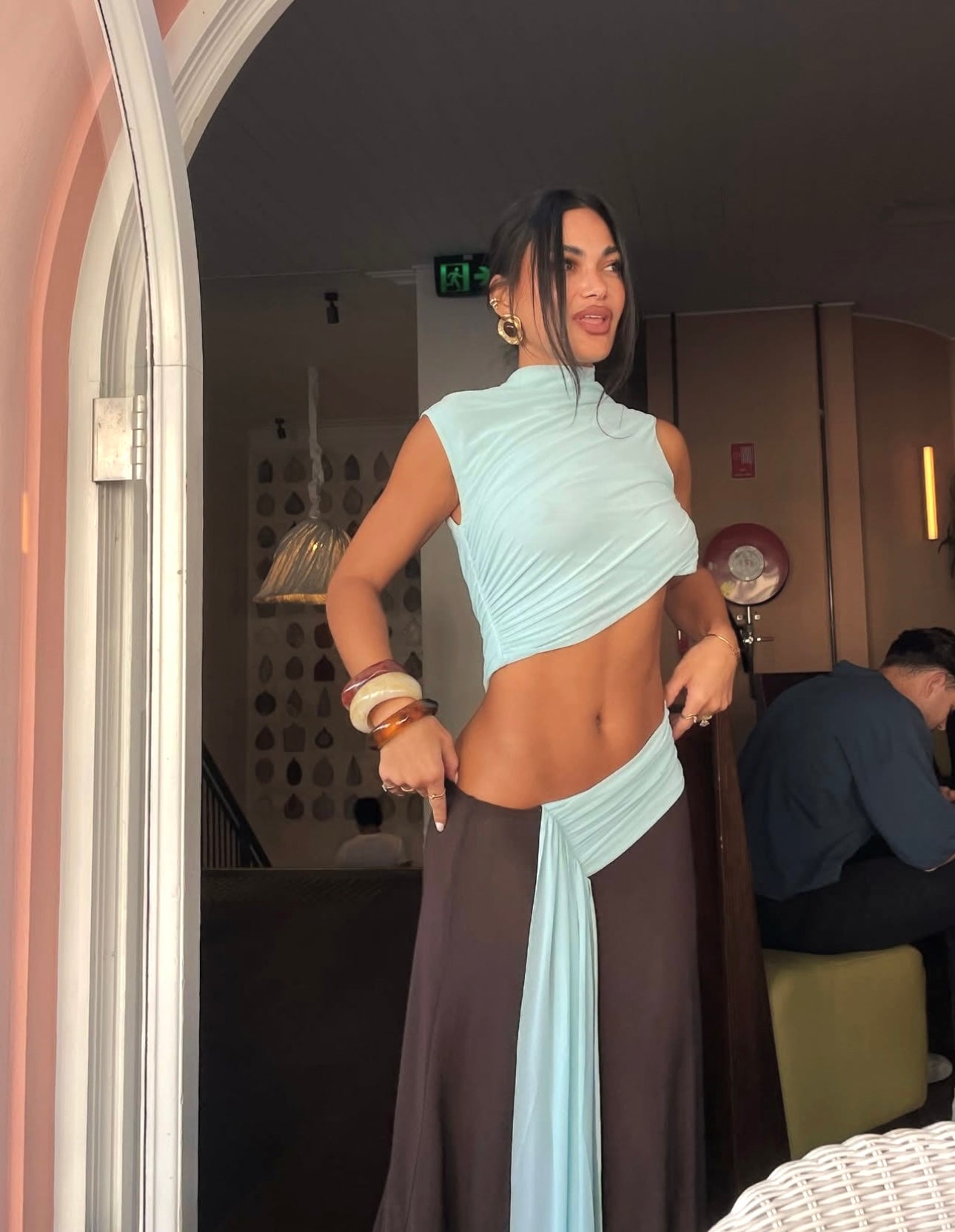 This striking asymmetric midi dress, crafted from soft mesh, features a high neckline with a contrast colour skirt, creating a captivating silhouette perfect for wedding guest attire, formal events, or a stylish night out.